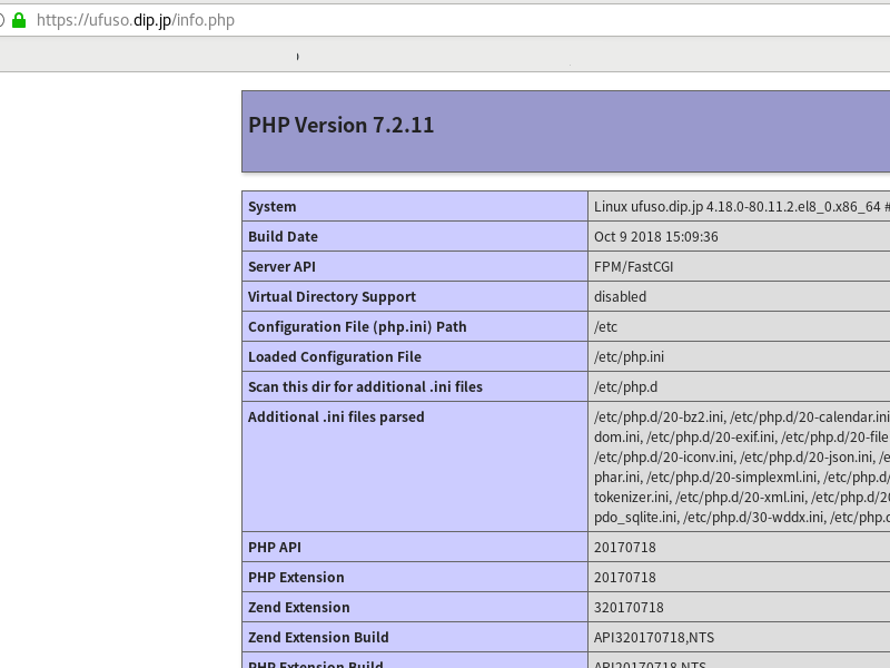 PHP 7.4.19 (cli) (built: May 4 2021 11:06:37) ( NTS ) #Webフォルダ(html)内にPHP情報を表示させるPHPファイルを作成 [root@ufuso ~]# echo "echo '' > /usr/share/nginx/html/info.php