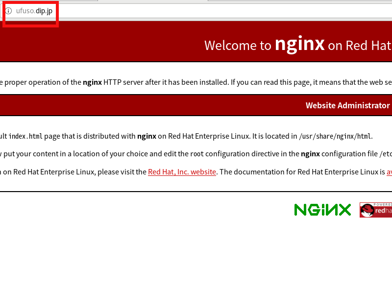 | #ユーザーをrootに変更 [tu@ufuso ~]$ su – #rootのパスワードを入力(入力内容は表示されない) パスワード: #Nginxのインストール 完了しました! #Nginxの設定 # Load configuration files for the default server block. #ufuso.dip.jpをhostsファイルに登録。「192.168.24.240 ufuso.dip.jp」は例示 192.168.24.240 ufuso.dip.jp #Nginxの起動と自動起動設定 [root@ufuso ~]# systemctl enable --now nginx