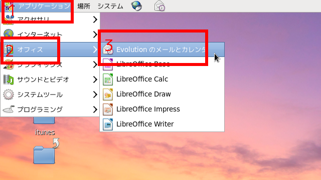 赤枠1の「アプリケーション」をクリックして表示される一覧から赤枠2の「オフィス」をクリックし、さらに表示される一覧から赤枠3の「Evolution」をクリックします。
