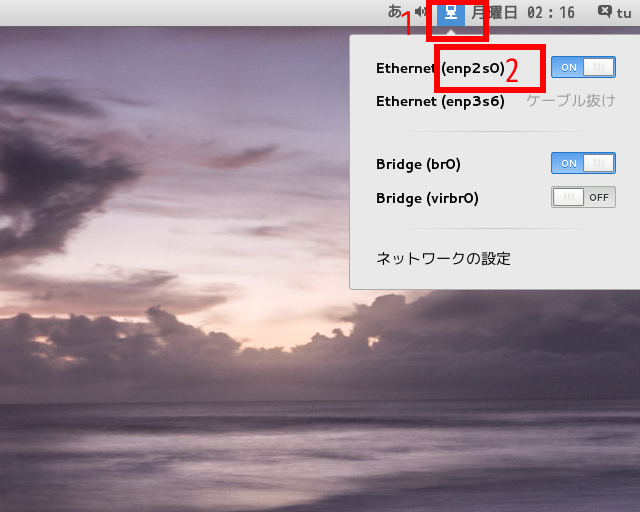 赤枠1のネットワークアイコンをクリックして、接続しているifcfgの名称を確認します。下図では赤枠2になります。