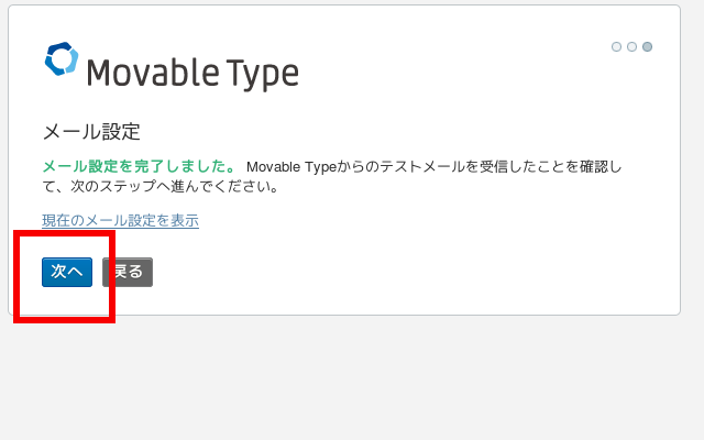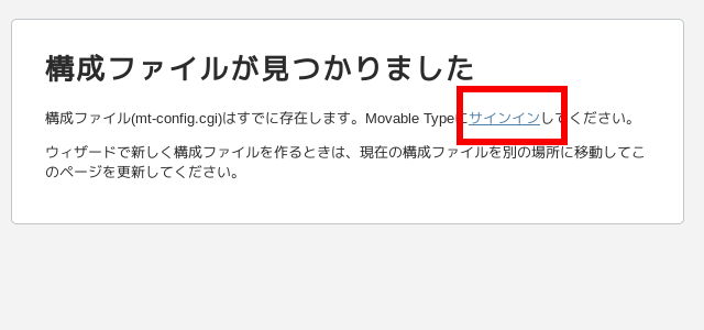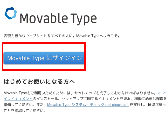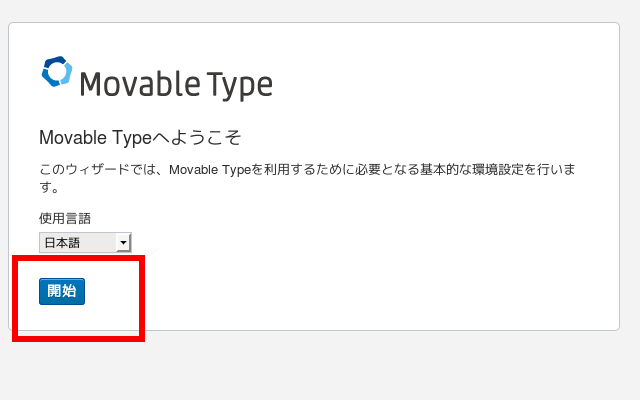 (1)Movable Typeをインストールしたhttp://yoursite/mt6/にアクセスし(「mt6」は例示)、赤枠をクリックして次に進む