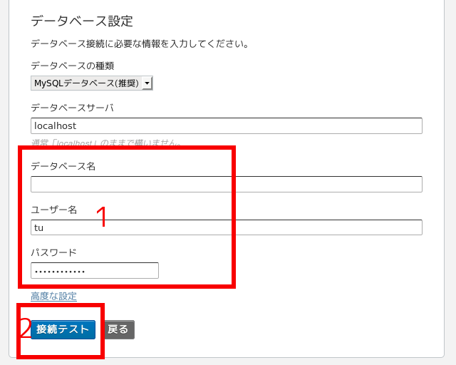 (4)上記3で設定したとおりにデータベース項目を赤枠1に入力し、赤枠2の「接続テスト」をクリック