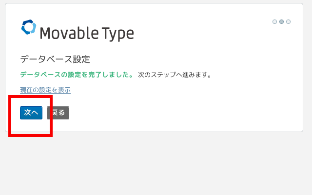 (5)「データベースの設定を完了しました」と表示されれば、赤枠の「次へ」をクリック