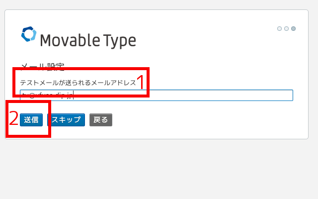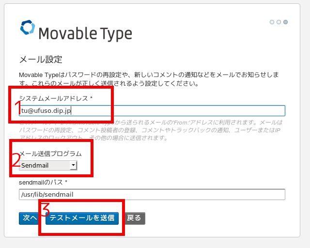 (6)管理用のメールアドレスが必要になるので、赤枠1にメールアドレスを入力し、赤枠2は分からない場合には「Sendmail」を選択し、赤枠3の「テストメールを送信」をクリック