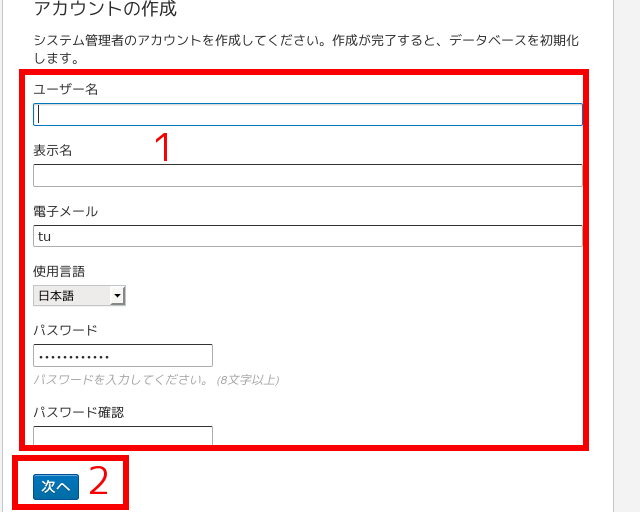 (11)ログインユーザーを作成してください。赤枠1に各項目を入力し、赤枠2の「次へ」をクリック