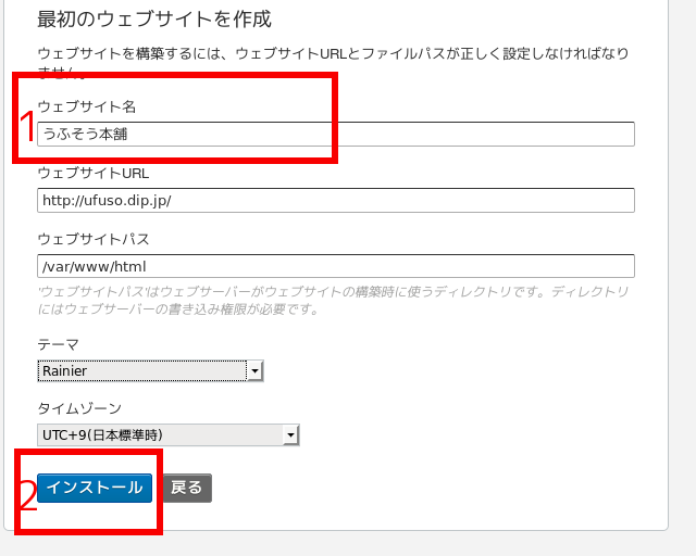 (12)赤枠1の「ウェブサイト名」に好きな名称を入力して、赤枠2の「インストール」をクリック
