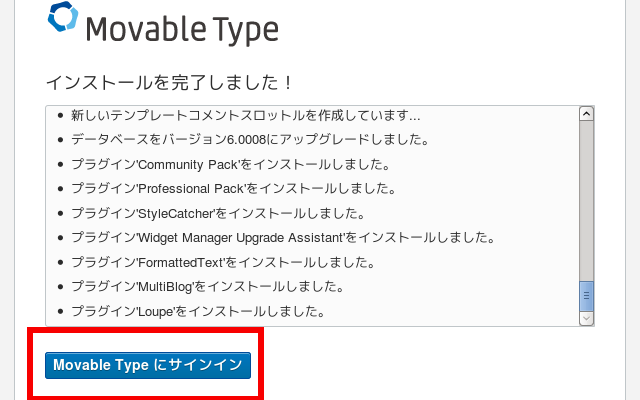 (13)「インストールを完了しました!」という画面が表示されたら、赤枠の「Movable Type にサインイン」をクリック
