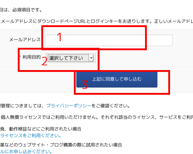 (2)Movable Typeの個人無償ライセンス取得サイトのURLとパスワードが記載されたメールが届くので、受け取るためのメールアドレスを赤枠1に登録し、赤枠2で用途を選択し、赤枠3の「上記に同意して申し込む」をクリック