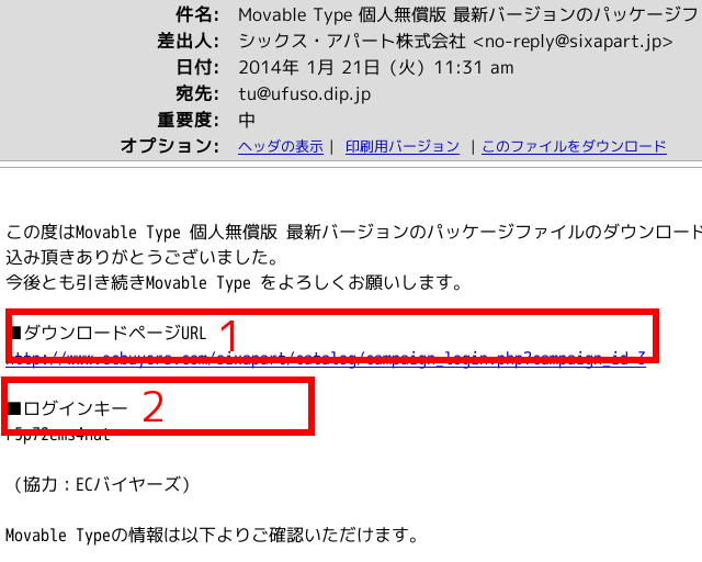 (3)数分以内にメールが届くので確認すること。メールを開くと赤枠1にダウンロードサイトのURLがあるのでそれをクリックしてダウンロードサイトに移動する。赤枠2の「ログインキー」はダウンロードサイトの中へログインするために必要なので、あらかじめコピーしておくこと