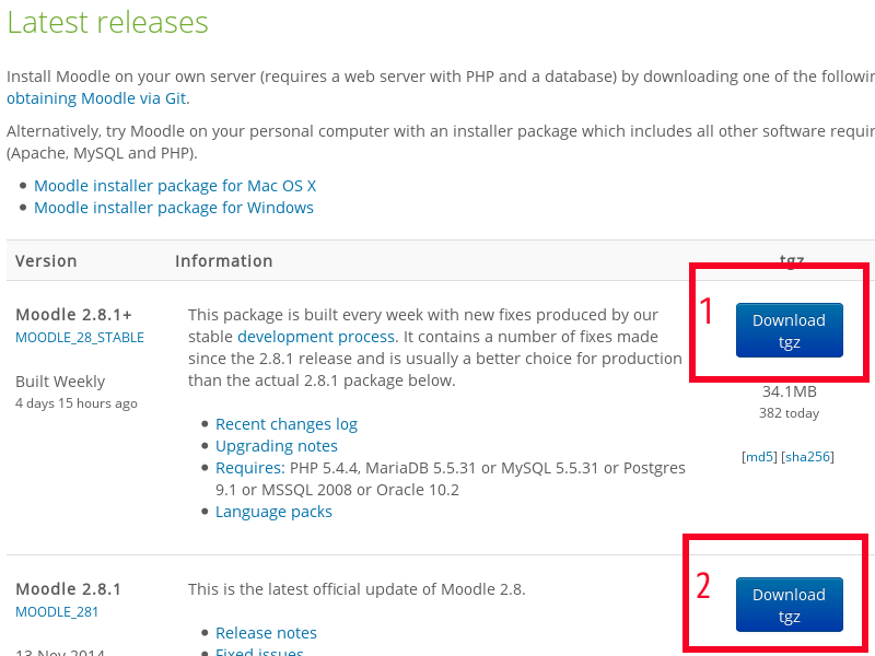 Moodleのダウンロード・サイトに移動して赤枠1の最新版か赤枠2の安定版をクリック。以下の説明は赤枠1を選択した例で行う。(以下の図はすべてクリックすると拡大する)