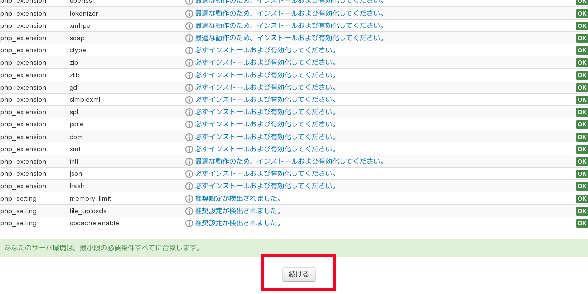 [root@ufuso ~]# yum -y --enablerepo=epel install php-xmlrpc php-soap ← moodleの インストールに足りないものを追加 インストール: php-soap.x86_64 0:5.4.16-23.el7_0.3 php-xmlrpc.x86_64 0:5.4.16-23.el7_0.3 完了しました! [root@ufuso ~]# yum -y --enablerepo=epel install php-pear php-devel httpd-devel ← ZendOpcache-betaのインストールに必要なソフトを入れる パッケージ 1:php-pear-1.9.4-21.el7.noarch はインストール済みか最新バージョンです パッケージ php-devel-5.4.16-23.el7_0.3.x86_64 はインストール済みか最新バージョンです パッケージ httpd-devel-2.4.6-18.el7.centos.x86_64 はインストール済みか最新バージョンです 何もしません [root@ufuso ~]# pecl install ZendOpcache-beta ← ZendOpcache-betaのインストール Build process completed successfully ← ZendOpcache-betaのインストールは成功 Installing '/usr/lib64/php/modules/opcache.so' install ok: channel://pecl.php.net/zendopcache-7.0.3 configuration option "php_ini" is not set to php.ini location You should add "zend_extension=opcache.so" to php.ini ← php.iniに zend_extension=opcache.soを追記の指示 [root@ufuso ~]# vi /etc/php.ini ← php.iniの編集 zend_extension=/usr/lib64/php/modules/opcache.so [opcache] opcache.enable=1 opcache.enable_cli=1 opcache.memory_consumption=128 opcache.interned_strings_buffer=8 opcache.max_accelerated_files=4000 opcache.revalidate_freq=60 opcache.fast_shutdown=1 ← 指示どおり最後尾に追記 [root@ufuso ~]# systemctl reload httpd ← WEBサーバー再起動 |