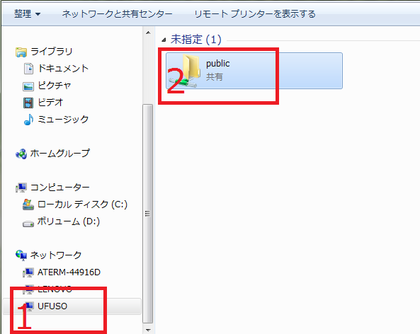 Windowsクライアント側で「マイネットワーク」を開いてpublicというフォルダが表示されていることを確認できたら、パスワード無しでファイルの読み書き削除ができることも確認のこと。下図の赤枠内右にあるフォルダが説明してきた例示の共有フォルダです。