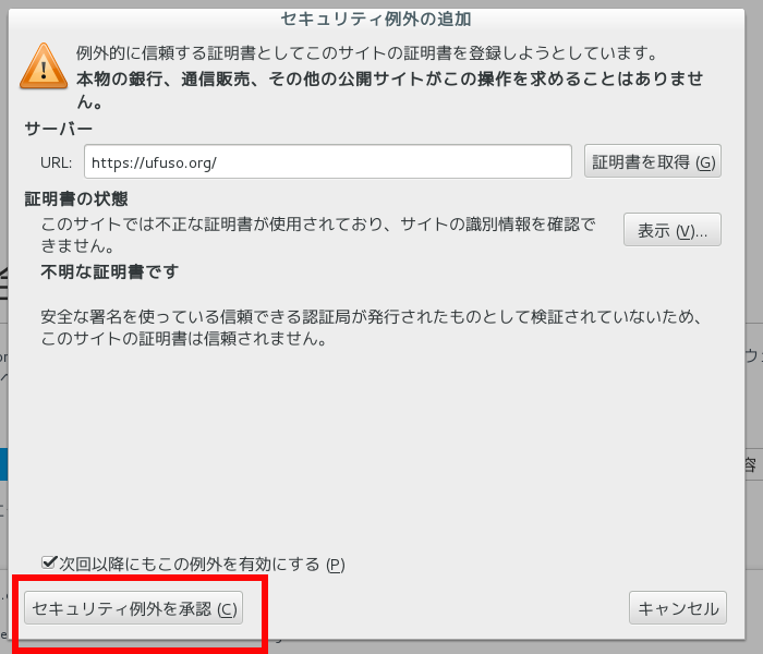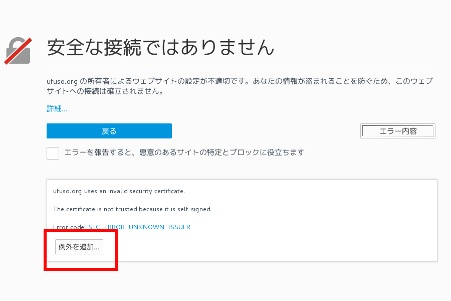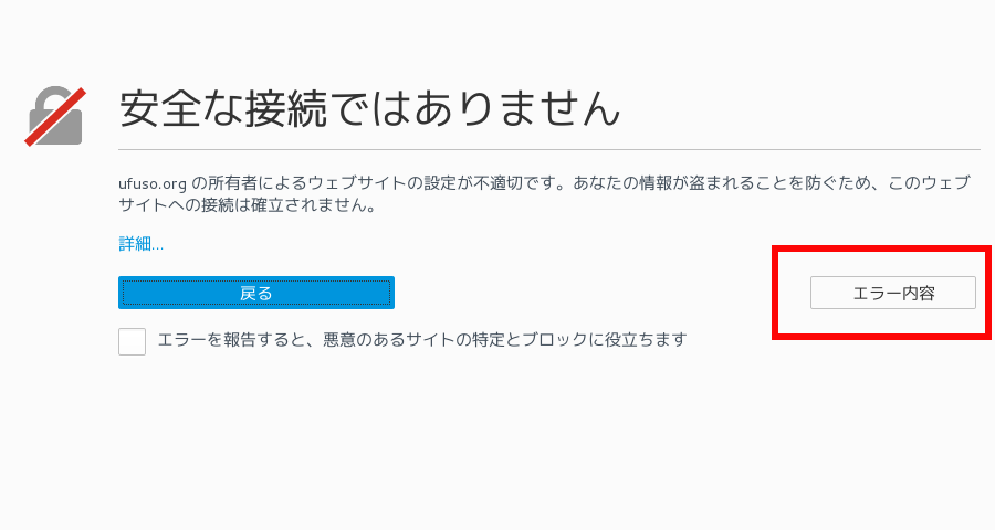 自サイト(例示ではhttps://ufuso.dip.jp/)にアクセスして「セキュリティの警告」ウィンドウが表示されるので、赤枠の「エラー内容」をクリック