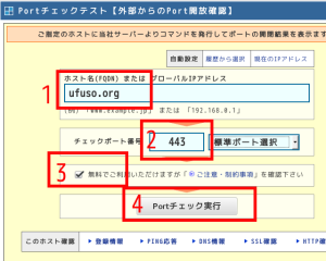 ポートチェック【外部からポート開放確認】で赤枠1の「host名」にサーバー名(例:ufuso.dip.jp)、赤枠2の「port番号」に443と入力して、赤枠3にチェックを入れ、赤枠4の「ポートチェック」ボタン押下。