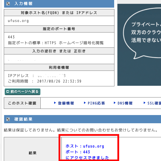赤枠の「ホスト=ufuso.dip.jp ポート=443 にアクセスできました。」が表示されることを確認。
