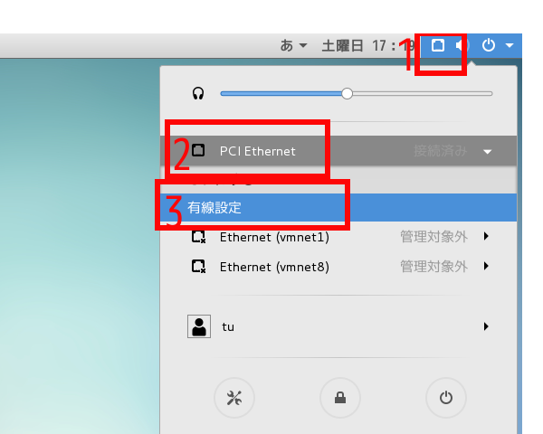 1 赤枠1のネットワークアイコンが表示されていない場合には、右端の「▽」アイコンをクリックして赤枠2を表示させ、その右端の「▽」をクリックして赤枠3の「有線」を表示させてクリックします。