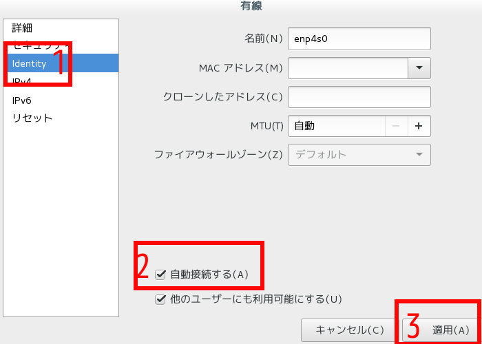 3 赤枠1の「Identity」をクリックして、赤枠2の「自動接続する」にチェックを入れ、赤枠3の「適用」をクリックします。