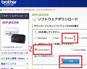 4.赤枠1の「Linux」、赤枠2の「Linux(rpm)」を選択して、赤枠3の「決定」をクリック