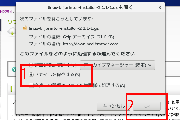 7.赤枠1の「ファイルを保存する」を選択して、赤枠2の「OK」をクリック