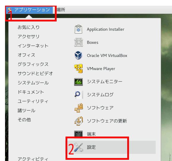 1.赤枠1の「アプリケーション」をクリックして、赤枠2の「設定」をクリック