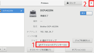 5.通常使うプリンターに設定するなら赤枠1の「デフォルトのプリンター」にチェックを入れ、赤枠2の「×」をクリック
