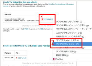 (3)ここをクリックして「Extention Pack」のサイトへ移動。表示された画面の赤枠1の「ExtPack」を右クリックし、表示される一覧から赤枠2の「リンクのURLをコピー」をクリック。