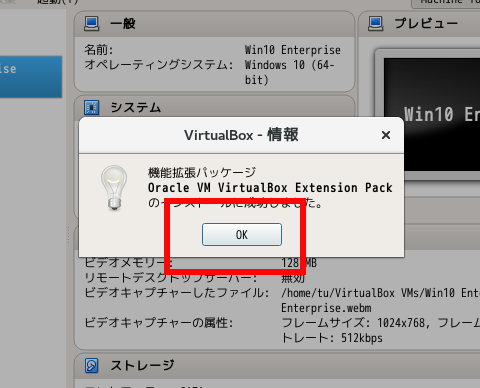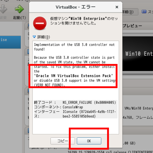 (2)エラーが出て、上赤枠の「Extention Pack」をinstallする必要があるとのこと。下赤枠の「OK」をクリック。