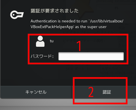 (7)赤枠1にユーザーのパスワードを入力して、赤枠2の「認証」をクリック。