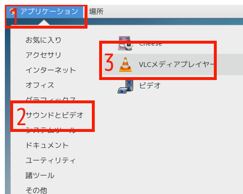 (1)赤枠1の「アプリケーション」をクリックすると表示される赤枠2の「サウンドとビデオ」をクリックし、表示される赤枠3の「VLCメディアプレイヤー」をクリック