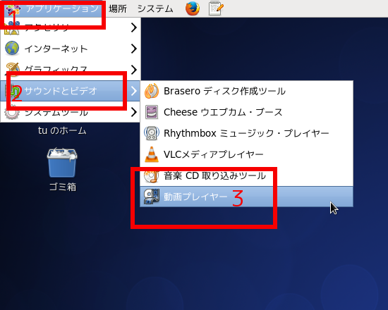(1)赤枠1の「アプリケーション」をクリックすると表示される赤枠2の「サウンドとビデオ」をクリックし、表示される赤枠3の「動画プレーヤー」をクリック
