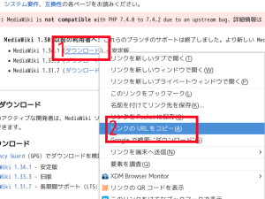 以下の記述はGNOME端末を使います。MediaWikiのダウンロード・サイトに移動して最新版を確認。赤枠1の「ダウンロード」をクリックして、表示される一覧から赤枠2の「リンクのURLをコピー」を(左)クリックし、URLをコピーしておく(以下のすべての画像はクリックすると拡大表示)