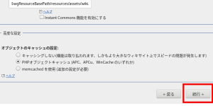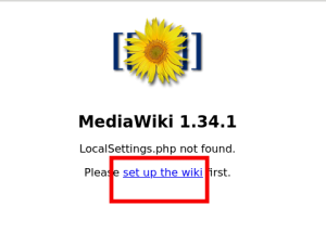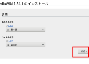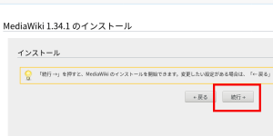 1.MediaWikiをインストールしたhttp://yoursite/ mwiki/にアクセスし、赤枠をクリックして次に進む(画像はクリックすると拡大。以下同じ)