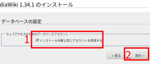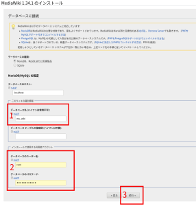 4.赤枠1にデータベース名を、赤枠2にユーザー名とパスワードを入力して、赤枠3の「続行」をクリック