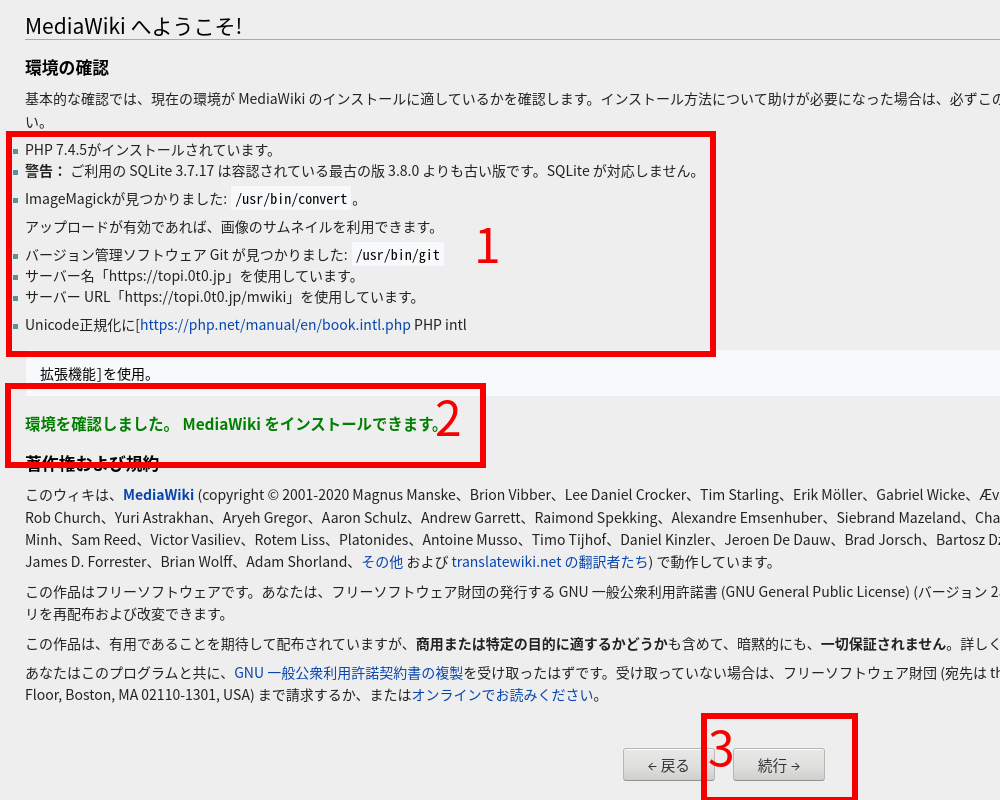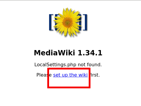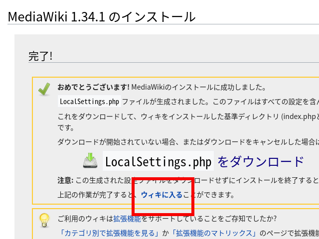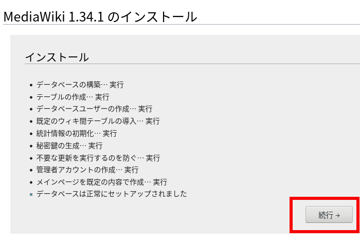 1.MediaWikiをインストールしたhttp://yoursite/ mwiki/にアクセスし、赤枠をクリックして次に進む(画像はクリックすると拡大。以下同じ)