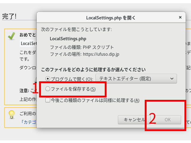 11.インストールが終了したらこの画面になるので、赤枠1の「ファイルを保存する」をクリックして、赤枠2の「OK」をクリック