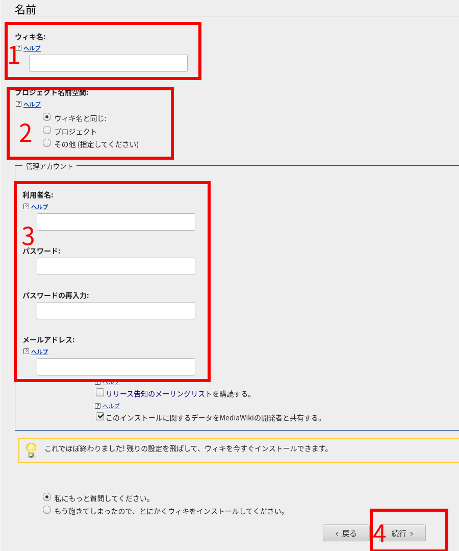 6.赤枠1にウイキ名、赤枠3に利用者名とパスワードを入力して、赤枠3の「続行」をクリック