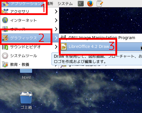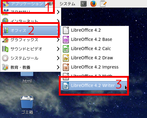 (1)下図赤枠1の「アプリケーション」をクリックし、表示される一覧から赤枠2の「オフィス」を選択し、さらに表示される一覧から赤枠3の「LibreOffice4.2」を選択してアプリケーションが起動すればOK。