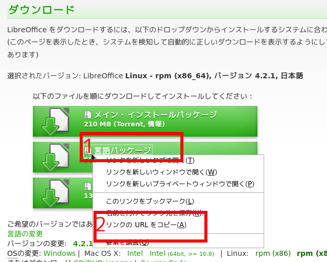 (2)赤枠1の「LibreOffice_4.2.1_Linux_x86-64_rpm.tar.gz」を右クリックし、表示される一覧から赤枠2の「リンクのURLをコピー」を左クリック