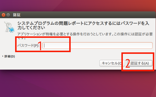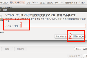 (11) この画面が表示されるようなら、UserIDのpasswordを赤枠1に入力して、赤枠2の「認証する」をクリック。