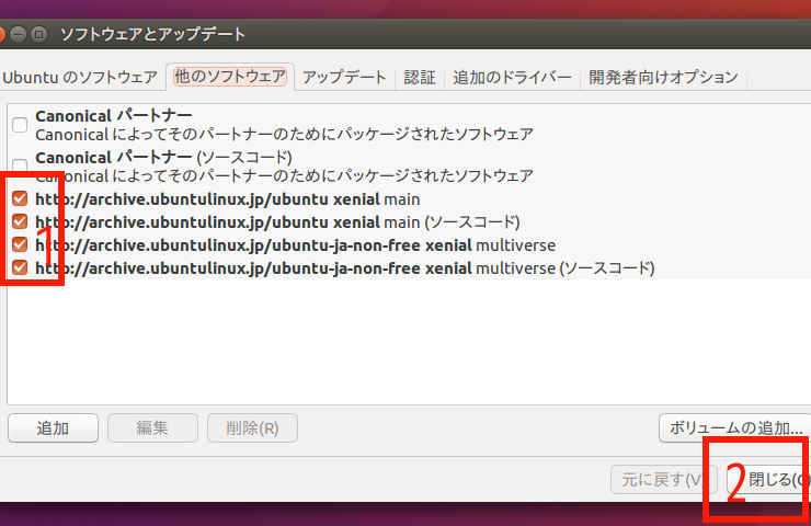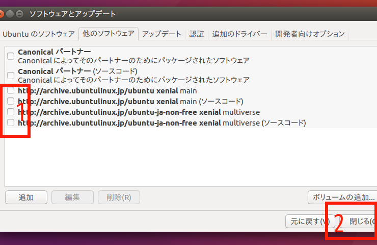 (10)「他のソフトウェア」tabをクリックして、表示される画面の赤枠1のチェックをすべて外し、赤枠2の「閉じる」をクリック。
