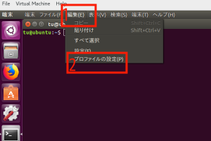 (6) GNOME端末が開きましたら、赤枠1の「編集」クリックし、表示される一覧から赤枠2の「プロファイルの設定」をクリック。