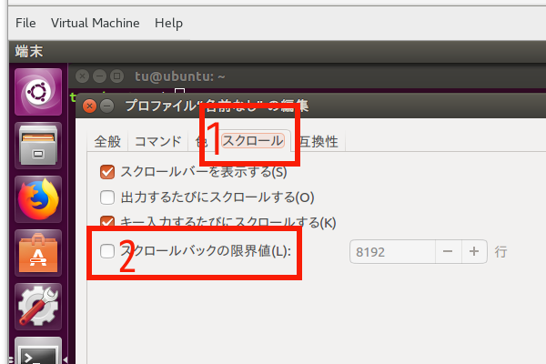 (7) 設定画面が表示されますので、赤枠1の「スクロール」タブをクリックし、赤枠2の「スクロールバックの限界値」のチェックを外す。