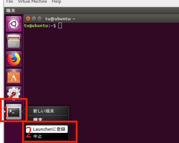 (8) 画面左端に表示されている「端末」アイコンを右クリックし、表示される一覧から「Launcherに登録」をクリックして、アイコンをデスクトップに常時表示させる。
