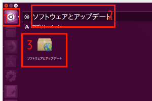 (9) 赤枠1の検索iconをクリックして、表示される赤枠2の検索窓に「ソフトウェアとアップデート」と入力すると赤枠3の「ソフトウェアとアップデート」iconが表示されるので、それをクリック。