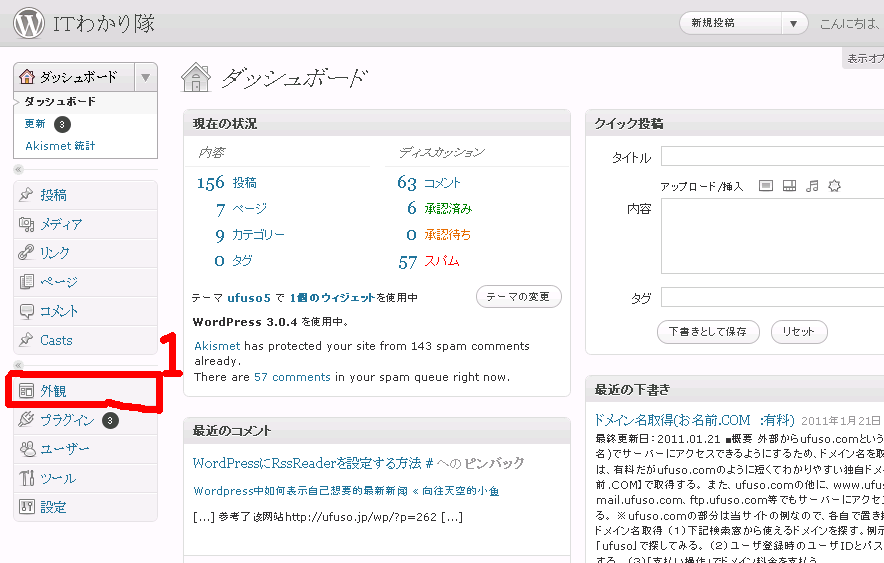 あなたのユーザー名とパスワードを入力して、「ログイン」ボタンをクリックします。ログイン画面の出し方ですが、WordPressのURL(例示ですと「https://wp.ufuso.jp/」)の後に「wp-admin/」を追加(例示ですと「https://wp.ufuso.jp/wp-admin/」)してReturnキー(又はEnterキー)を押すと管理画面になります。
