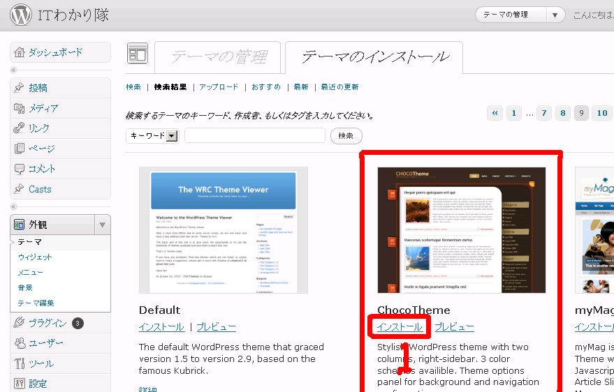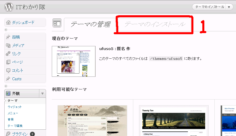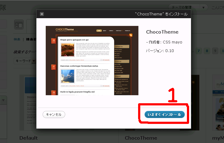 2.枠1の「テーマのインストール」タブをクリックします。