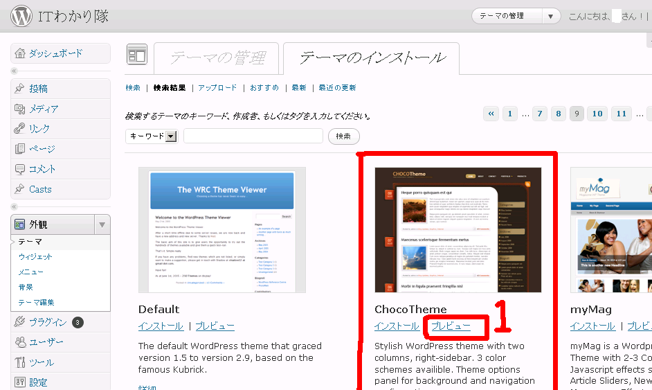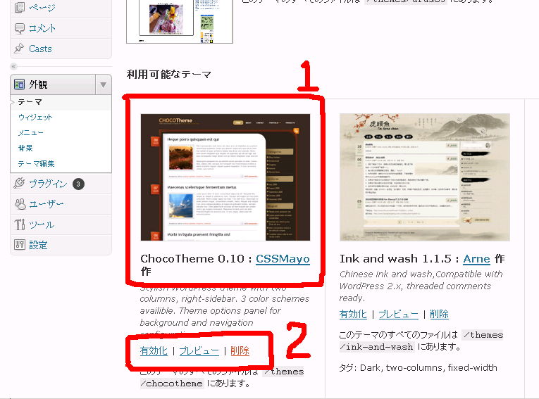 10.インストールが完了すると上記2の画像にインストールしたテーマが追加されます。枠2の説明は文字通りです。