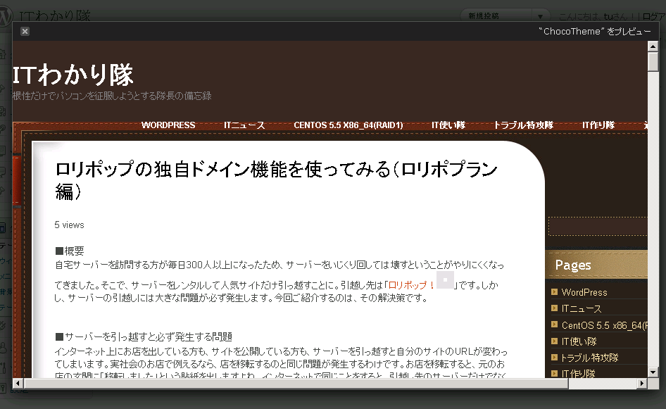 「有効化」をクリックすると自サイトのテーマをインストールしたテーマに入れ替えます。